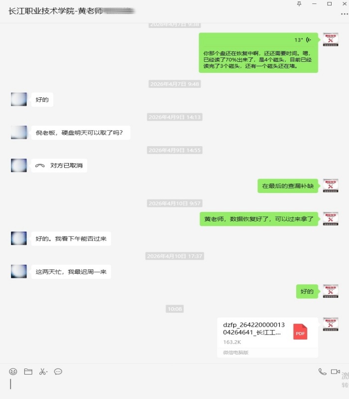 长江职业技术学院的老师送过来一个西数2T移动硬盘,客户说移动硬盘可以打开,里面的文件夹打不开,显示文件目录损坏无法访问,经检测硬盘磁头坏了一个导致文件无法读取,与客户沟通好后,工程师在无尘工作室更换好的磁头后,再在PC3000技术处理后,成功读取文件镜像,数据完美恢复。